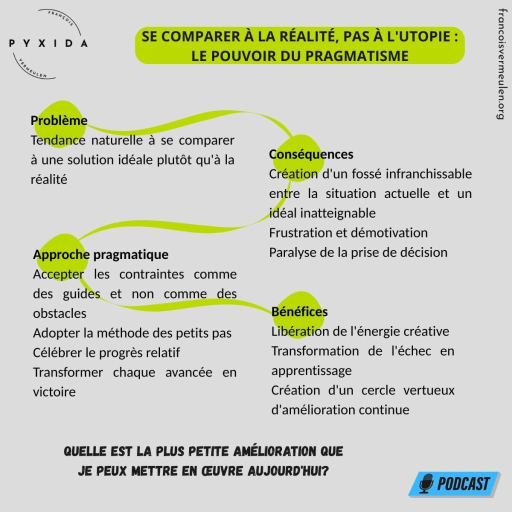Donc, la prochaine fois que vous faites face à un problème, posez-vous cette question : « Quelle est la plus petite amélioration que je peux mettre en œuvre aujourd’hui ? » Vous serez surpris de voir comment cette approche pragmatique peut débloquer des situations qui semblaient insurmontables.