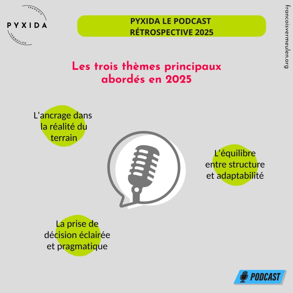 Mais revenons à l’essentiel : qu’avons-nous exploré ensemble cette année ? En analysant les épisodes publiés, trois grandes thématiques se dégagent naturellement. Elles forment le socle de ce que Pyxida cherche à transmettre : une approche pragmatique et humaine de la gestion de projet et de la transformation organisationnelle.