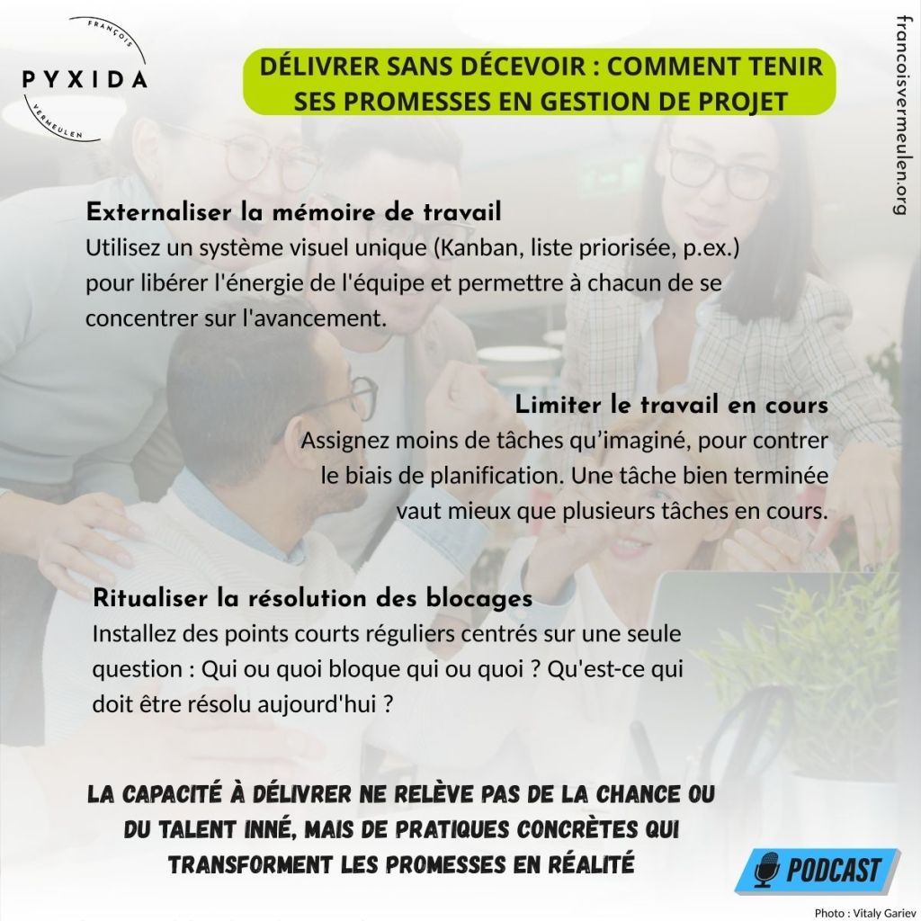 La capacité à délivrer ce que vous avez promis ne relève pas de la chance ou du talent inné. Elle ne dépend pas non plus d’avoir les meilleures ressources ou les conditions parfaites. Ces conditions n’existent jamais. Elle repose sur des pratiques concrètes et reproductibles : Un système partagé pour externaliser la complexité du projet, une discipline rigoureuse pour limiter le travail en cours et finir ce qui est commencé, des rituels réguliers pour maintenir l’alignement et résoudre les blocages rapidement, et une attention constante à la dimension humaine du projet.