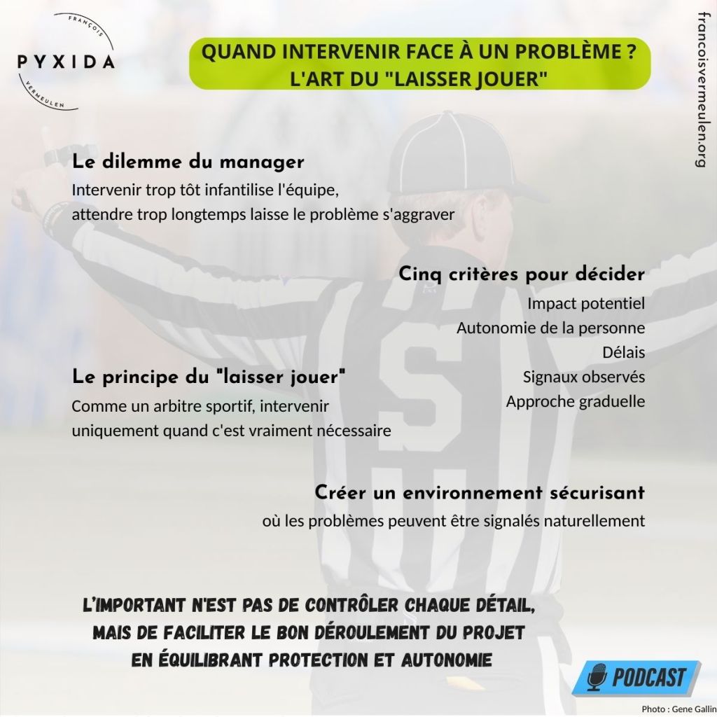 Mais au-delà de ces critères et de cette pratique, il y a quelque chose de plus fondamental que je voudrais partager avec vous. C’est que « laisser jouer » ne veut pas dire « laisser tomber ». Au contraire. Concrètement, « laisser jouer » en management de projet, ça signifie créer un environnement où les gens se sentent en sécurité pour signaler les problèmes. Ça veut dire établir des points de contrôle réguliers – des rituels d’équipe, par exemple – où les problèmes peuvent être discutés naturellement, sans dramatisation.