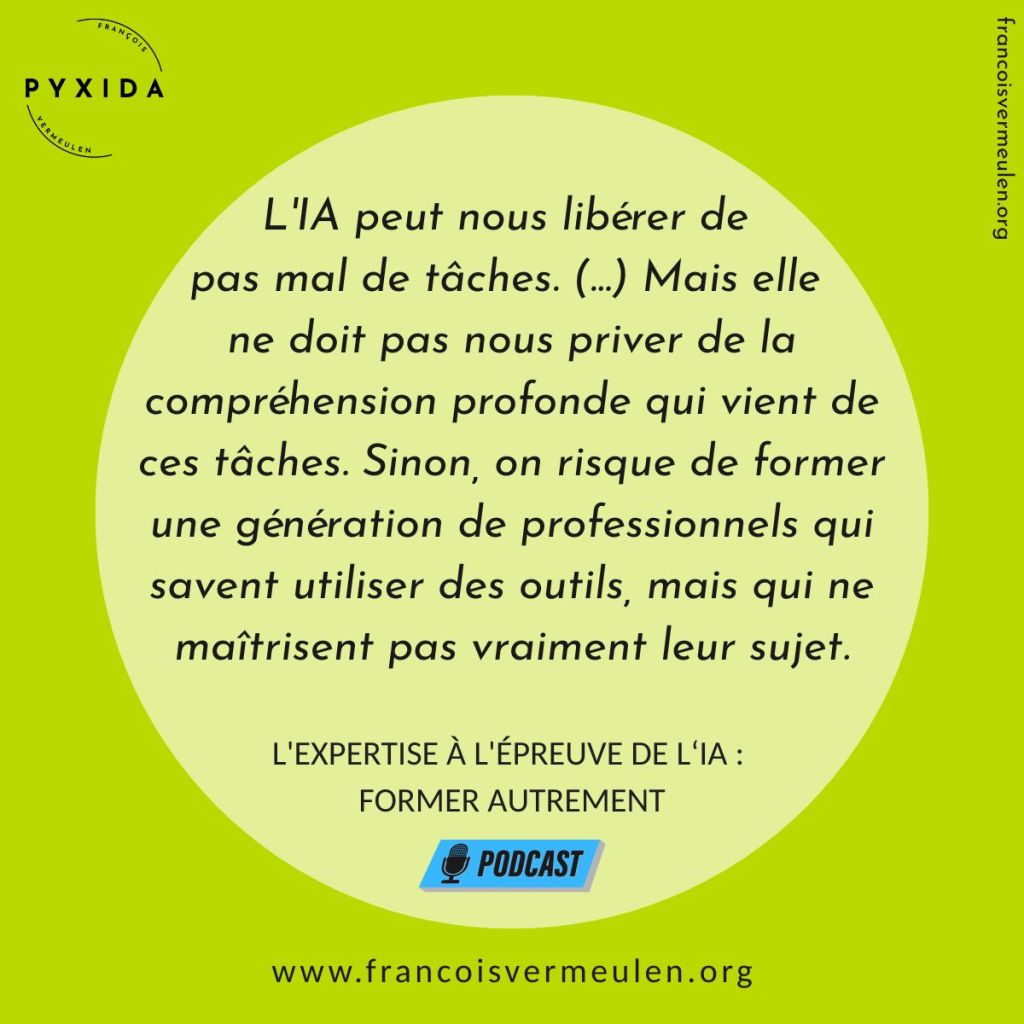 L’IA peut nous libérer de pas mal de tâches. C’est formidable. Mais elle ne doit pas nous priver de la compréhension profonde qui vient de ces tâches. Sinon, on risque de former une génération de professionnels qui savent utiliser des outils, mais qui ne maîtrisent pas vraiment leur sujet.