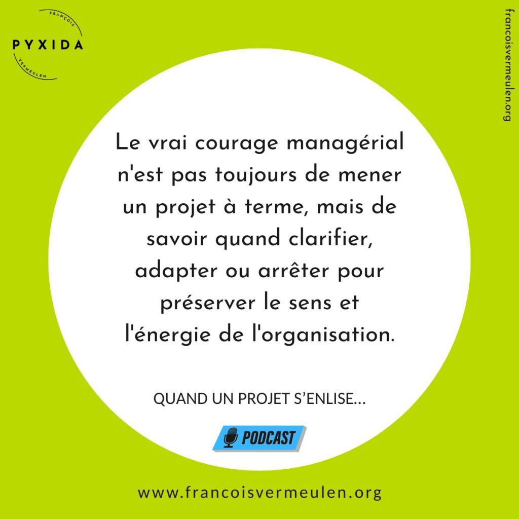 Je vais conclure avec une idée un peu paradoxale mais que je trouve juste. Quand un projet débute, on à tendance vouloir mener le projet à terme. On ne lâche rien. On va y arriver. Et c’est légitime. Normalement, un projet a été lancé pour une bonne raison, avec des bénéfices visés et attendus. Et pourtant, dans certains cas, le courage managérial c’est de dire stop. Stop, parce que le coût humain est trop élevé. Stop, parce que le contexte a changé. Stop, parce que continuer serait un acte d’orgueil, pas un acte utile.