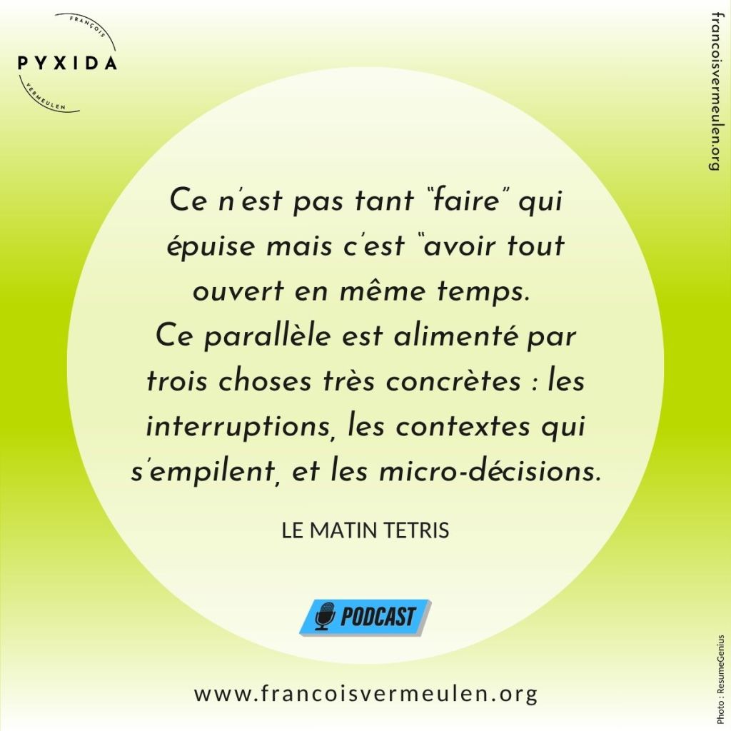 Troisième aliment du parallèle : les micro-décisions. Chaque mail, chaque message, chaque demande, ce n’est pas juste une information. C’est une rafale de questions : Je réponds maintenant ou plus tard ? Et si c’est plus tard… quand ? C’est une action, une attente, une clarification ? Je délègue ? Je relance ? Je classe ? C’est urgent… ou juste bruyant ? Et c’est là qu’un autre concept aide beaucoup à comprendre ce que tu ressens : le résidu d’attention (attention residue), étudié notamment par Sophie Leroy. L’idée est simple : quand tu passes d’une tâche A à une tâche B, une partie de ton attention reste accrochée à A. Tu n’es pas “pleinement” dans B. Et quand tu veux revenir à A, tu n’y reviens pas “proprement” non plus. Tu as des bouts d’attention qui restent collés, comme si tu avais plusieurs onglets qui continuent de tourner en arrière-plan. Et voilà le piège : Tu peux passer une heure à gérer le flux et te sentir vidé, parce que tu as surtout dépensé ton énergie en charges mentales invisibles.